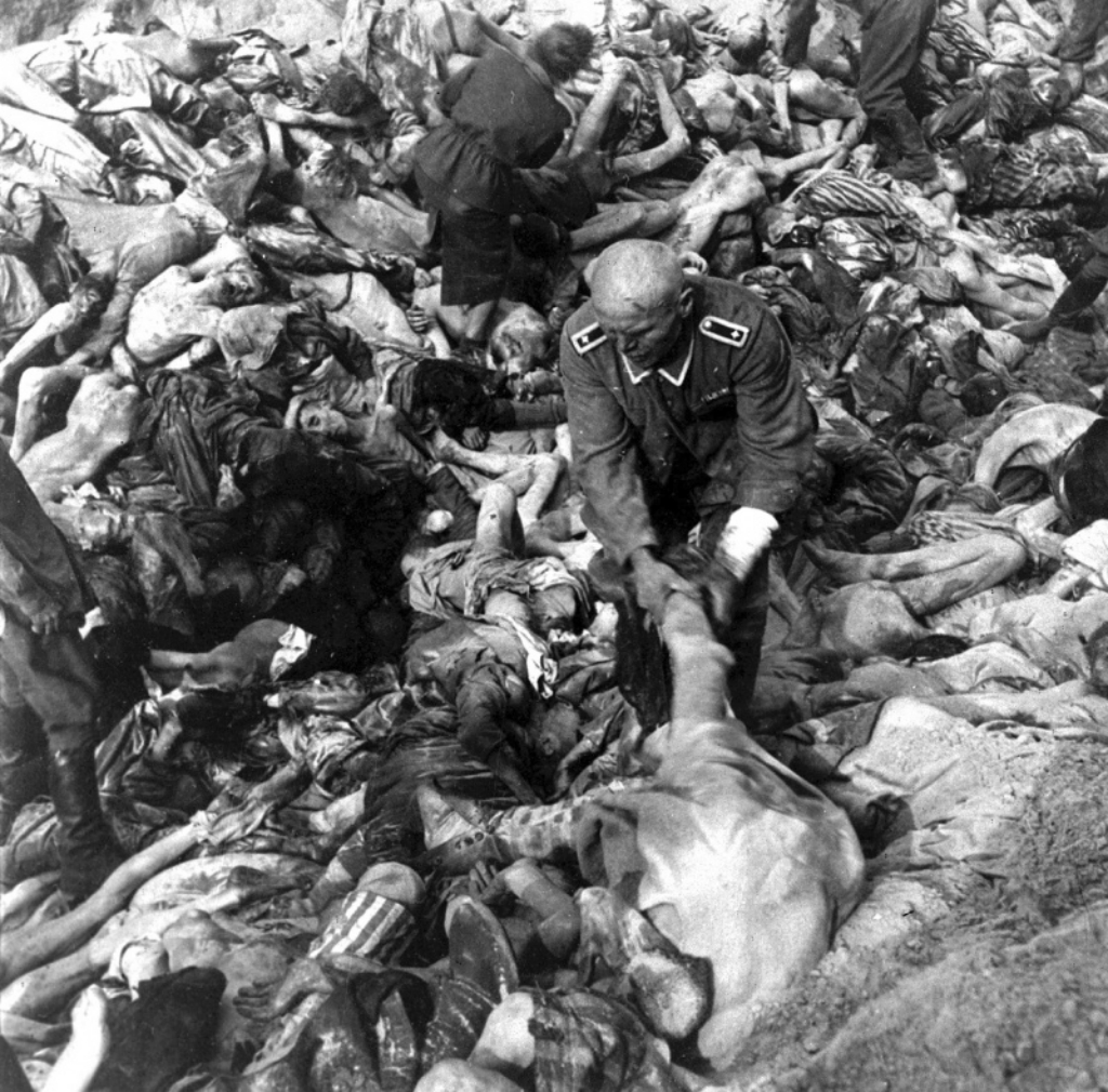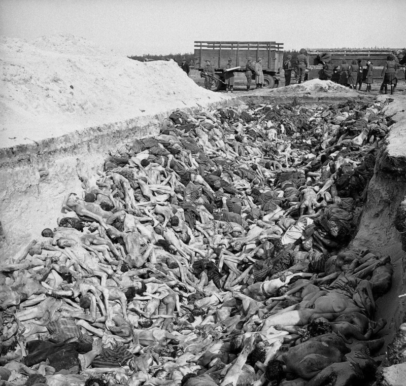 Женщины из охраны СС концлагеря Берген-Бельзен разгружают трупы узников для захоронения в братской могиле. На эти работы их привлекли союзники, освободившие лагерь. Вокруг рва - конвой из английских солдат. Бывшим охранницам в качестве наказания запрещено пользоваться перчатками, чтобы подвергнуть их риску заражения тифом.