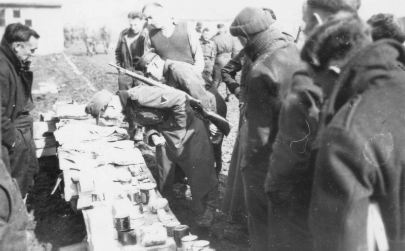 Немецкий солдат-конвоир на рынке концлагеря "Шталаг 383" в окружении пленных союзников.