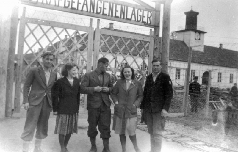 Пятеро освобожденных заключенных концлагеря Фальстад у ворот.
