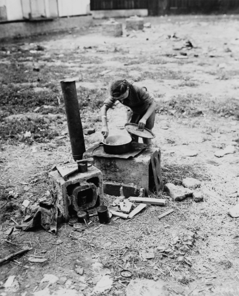 Украинская девочка, освобожденная из концентрационного лагеря в Зальцбурге (Австрия), готовит еду на маленькой печке.