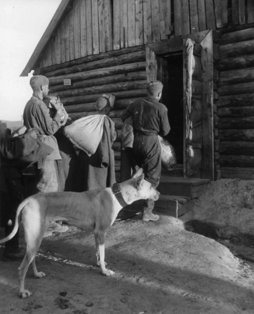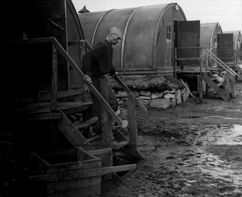 Советский военнопленный выходит из барака в концлагере Салтфьеллет в Норвегии.