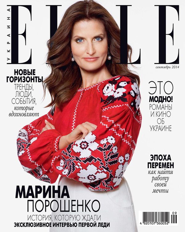 Первая леди Украины Марина Порошенко приняла участие в фотосессии для украинской версии гламурного журнала "Elle". 52-летняя жена президента появится на обложке сентябрьского номера издания.