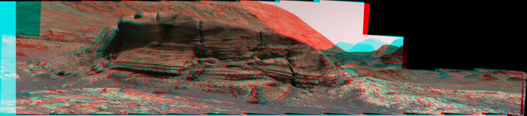 Марсоход снимал одну панораму с расстояния 40 метров от обнажения породы, затем откатывался в сторону и снимал другую с того же расстояния, таким образом получился стереоскопический эффект.