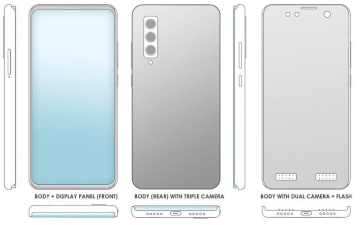 На схеме видно, что тройная камера расположена на задней стороне корпуса. Фронтальная камера будет расположена под экраном. А внизу смартфона находится порт USB Type-C для зарядки и два динамика.
