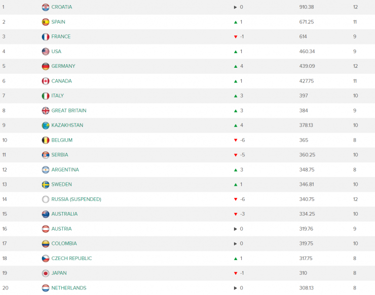 Интересно, что из 15 сборных Davis Cup Finals 2022 13 находятся в топ-15 рейтинга. За пределами только Нидерланды, которые занимают 20-е место, и Южная Корея, поднявшаяся на 21-ю строчку (плюс шесть мест). Причем нидерландцы как раз обыграли Канаду, которая поднялась с седьмого на шестое место в рейтинге.