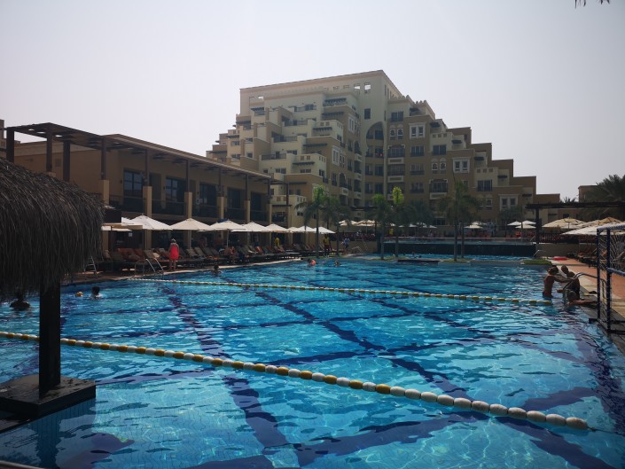 После прибытия в Шарджу автобус довозит туристов до отеля. В этом путешествии, организованном департаментом по развитию туризма эмирата Рас-эль-Хайма, нашим домом стал отель Rixos Bab Al Bahr, который расположился в начале специально построенной морской косы на берегу Персидского залива.