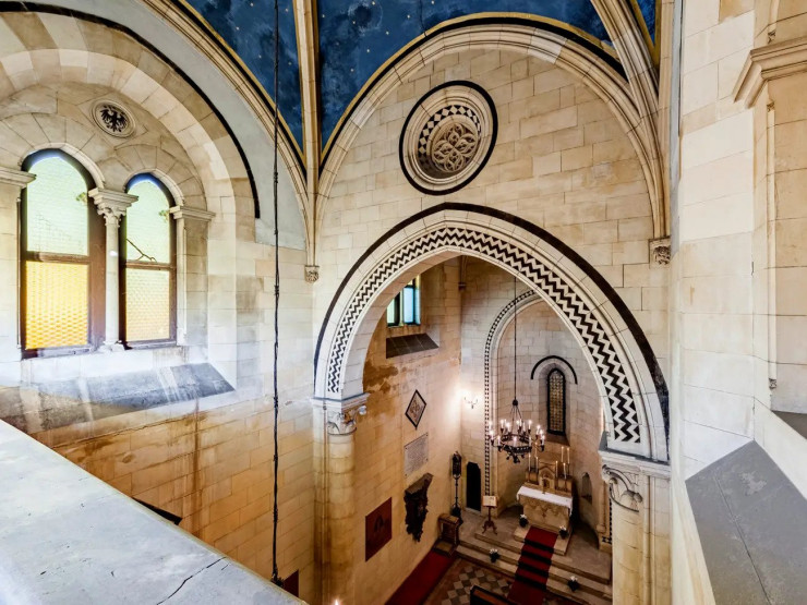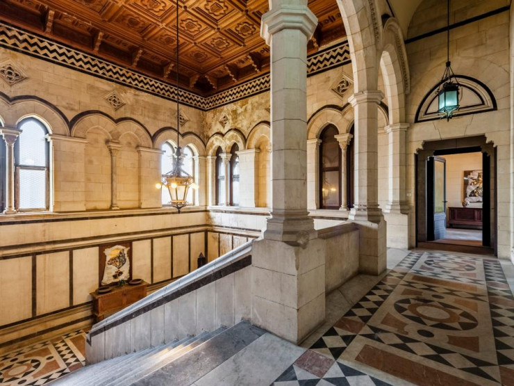 По данным издания, территория вокруг замка - около 43 тысяч квадратных футов. В доме расположены 22 спальни и винный погреб. Сам дворец имеет неоготическую архитектуру и обрамлен двумя башнями.