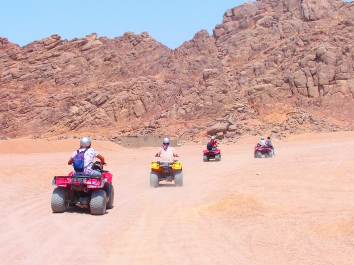 Бескрайнее небо, простор, пустыня, горы, скорость, свобода – вот что такое мотосафари на Синае! Квадроцикл настолько прост в управлении, что двух минут достаточно, чтобы ощутить себя с ним единым целым. На отдельных коротеньких участках удается развивать большую скорость, природа все интереснее, горы становятся все ближе, исчезает последняя растительность, вдалеке бредет караван из трех верблюдов, мы въезжаем в ущелье, где нет ничего, кроме песка, камней и красноватых скал причудливых очертаний. Мы здесь совершенно одни среди пустынного пейзажа, чем-то напоминающего марсианский.