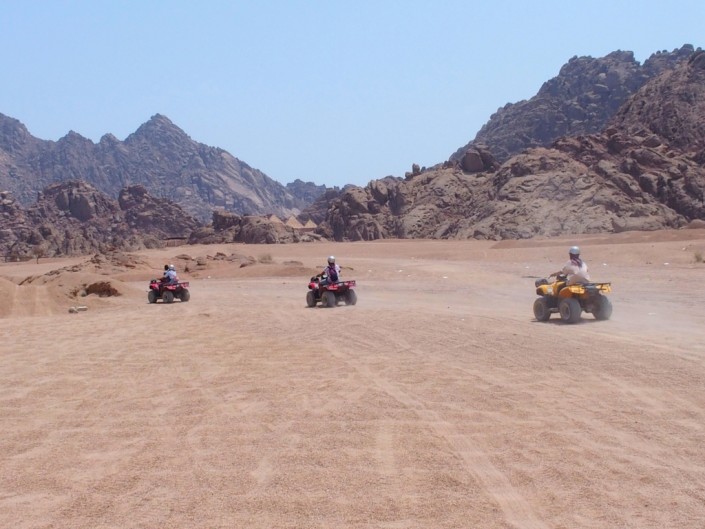В центре квадроциклов нам выдали красно-бело-черные арафатки. Так как такая же расцветка соответствует цветам национального флага Египта, мы решили, что стали египетскими бедуинами. Коротенький инструктаж (да и что рассказывать?! – квадроцикл прост как дважды два четыре: рычажок газа на правом руле и две ручки тормоза на передние и задние колеса) – и в путь! Единственная просьба гида-инструктора – ехать колонной, друг за другом.