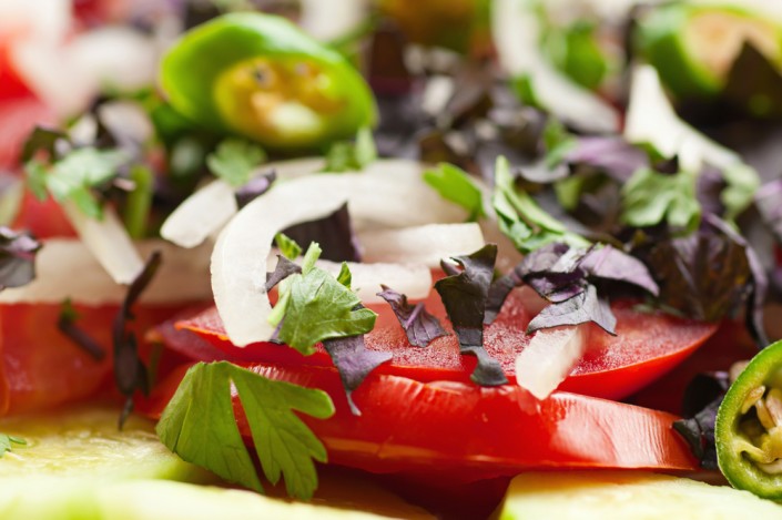 Грузинский стол невозможно представить без овощей. На столе их можно увидеть в свежем, тушеном, маринованном и жареном виде. Почетное место тут занимает грузинский салат. Это салат из огурцов и помидоров с большим количеством зелени (кинзы и базилика), заправленный кахетинским маслом либо ореховым соусом. Грибы с сулугуни, запеченные на кеци (традиционная глиняная тарелка), ну и, конечно же, пхали - это закуска в виде пасты из тушеных овощей, часто это шпинат, зеленая фасоль, баклажаны, свекольные листья. К овощам добавляются грецкие орехи, чеснок и всякая зелень.