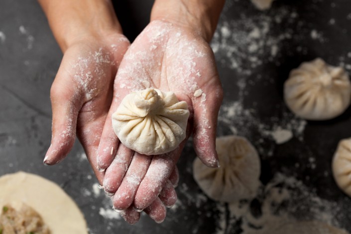 Хинкали - изобретение жителей горных районов Грузии. Самые лучшие хинкали делают в Хевсурети, Пшави и Тушети. В горных районах хинкали является основным блюдом. Считается, что кушать хинкали - это то же самое, что пить грузинское вино. И то, и другое непременно нужно уметь делать. Чаще всего в качестве начинки используют два вида рубленого мяса: свинину и говядину, наиболее популярные называются калакури, готовятся с зеленью, и мтиалури - без зелени. Также можно встретить жареные хинкали, мини-хинкали, хинкали с разной начинкой из грибов, сыра и картофеля. В Грузии хинкали принято есть только руками. Перед тем как отправить хинкали в рот, его надо хорошо посыпать черным перцем, потом немного надкусить, и выпить весь сок, который в нем содержится. И только потом стоит насладиться великолепным фаршем. И еще одна деталь: то место, где соединяются складки теста, и за что обычно удобно брать хинкали, называют "куди" - шапка. Его обычно не едят, и по их количеству считают, сколько хинкали съел человек.