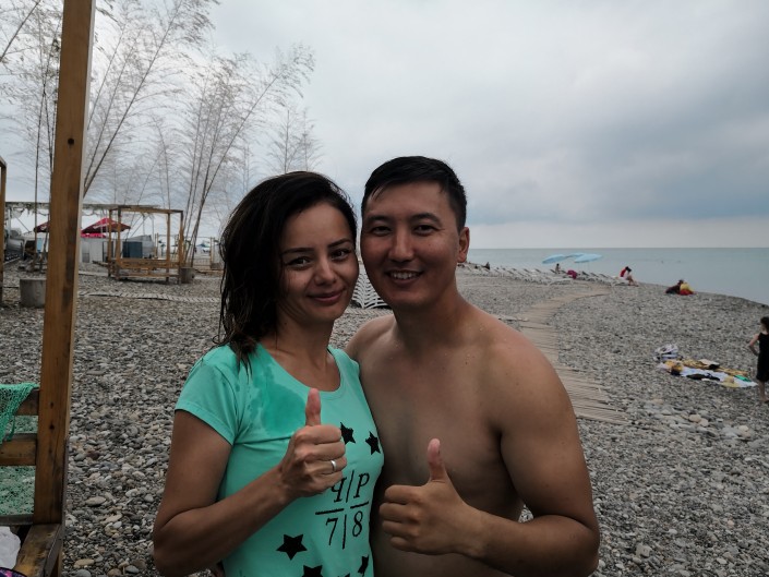 На пляже мне попалась счастливая  пара из Нур-Султана. По словам Жалельхана и Асель, они в восторге от местной кухни, особенно понравились хачапури по-аджарски.