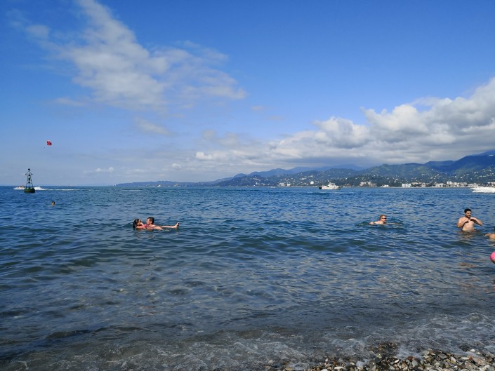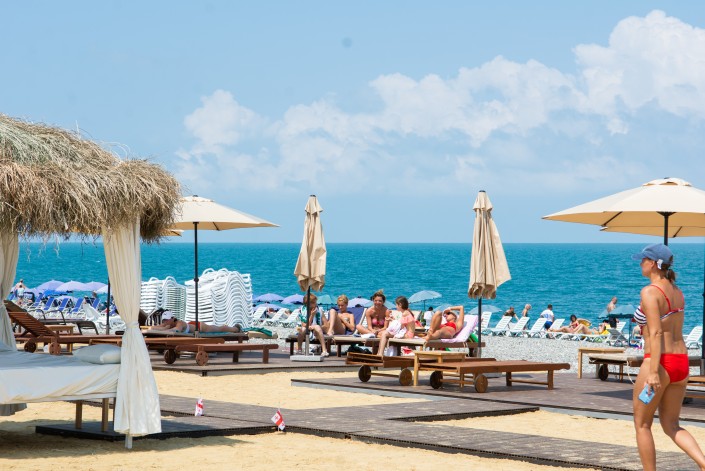 Пляж здесь общественный, но место всегда найдется – от бесплатного на камушках до платных лежаков у прибрежных ресторанов. К примеру, обустроенное место у ресторана Iveria Beach близ башни алфавита может обойтись в 30 лари на весь день плюс Wi Fi. Но не торопитесь – далее места дешевле, всего 3-5 лари за лежак, также плюс Wi Fi. Местами при ресторанах есть детские бассейны с водой из Черного моря.