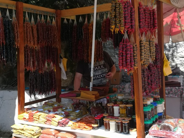 Далее по дороге в горы находится водопад Махунцети. По пути к нему много сувенирных лавок, точек со специями, медом, пастилой и чурчхелой.