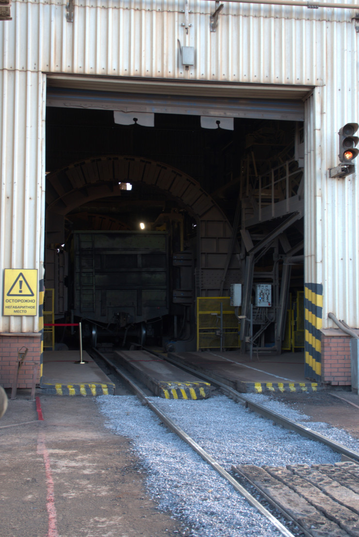 А в следующем цеху можно увидеть интересное устройство, с помощью которого на заводе за несколько секунд выгружают 93-тонный вагон. Оборудование так и называется - вагоноопрокидыватель.