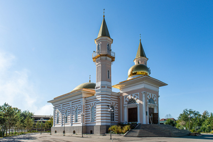 Здание имеет 16 окон оригинальной конструкции - прямоугольник, увенчанный кругом и обработанный с внешней стороны по окружности ложными камнями. Портальное помещение с резной дверью на высоком крыльце. Купол украшен золочеными полумесяцами. Мечеть окружена изящной кованой изгородью.