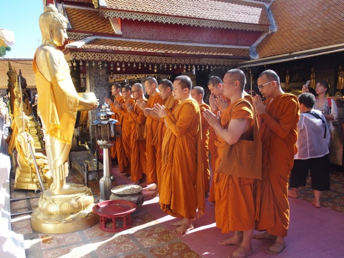 Были и восемь – по числу дней в тайской неделе (среда разбивается на два дня) – масляных светильников, выполненных в форме лотоса. Верующие, когда приходят, всегда доливают в них масло, чтобы постоянно горели. Это как немножко прибавить дней к своей жизни. Много чего еще интересного можно было здесь встретить, особенно если разбираться в буддийских нюансах. Так что тайцы говорили правду: без этого храма Чиангмай тебе не откроется. Кстати, перед самым уходом я зашел в главный вихан. Там на небольшом возвышении в боковой части сидел монах. Он периодически читал молитвы и благословлял собиравшихся вокруг него паломников, окропляя их водой – символом мудрости Будды. Получил благословение и я.