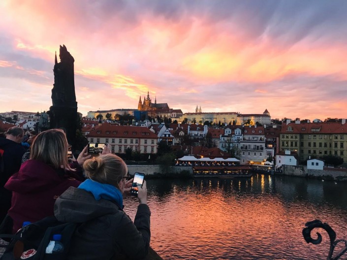 На улице уже вечерело, мост был все еще переполнен туристами, пытающимися сделать тысячное за день фото. У нас такое же выражение лица, как и у всех, - блаженная улыбка и восклицание: "Вау, как красиво". Багровый закат, тени от средневековых замков, мелодии уличных музыкантов и голоса на различных языках мира - все это придавало таинственности и романтичности этому месту. Ощущаешь себя, словно люди из будущего, которые попали в средневековье. Мне казалось, еще чуть-чуть и из-за угла появится королевская свита с придворными дамами.