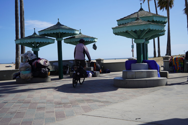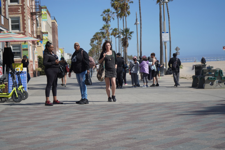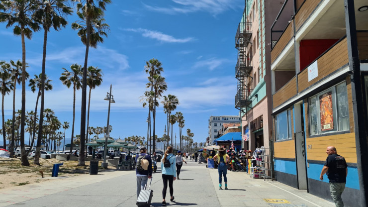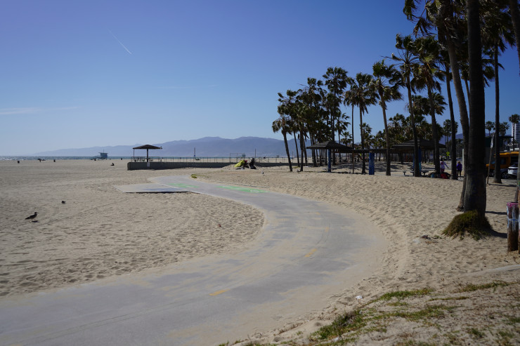 Свою мобильную выставку о Казахстане мы хотели провести в людном, но более спокойном месте. Без лишней суеты. Подумали сначала, что пляж Венеция отлично подходит. Отправились туда. Но спустя минут 10 решили никакой выставки не организовывать. Пляж сильно разочаровал.