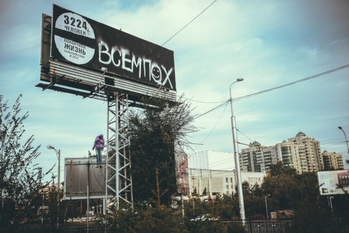 Отметим, что Паша Кас получил известность после таких работ, как "Трусы" с надписью "Год культуры" перед акиматом Алматы, "Свободу попугаям", которую он посвятил "диванным критикам" и другие.