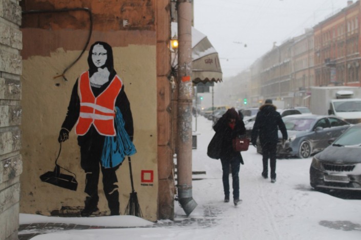 В начале года на стене еще одного дома появилось граффити Паши Каса - "Джоконда в образе дворника". Героиня картины Леонардо да Винчи предстала в необычном образе - в руках у нее веник и совок, а также мусорные пакеты.
