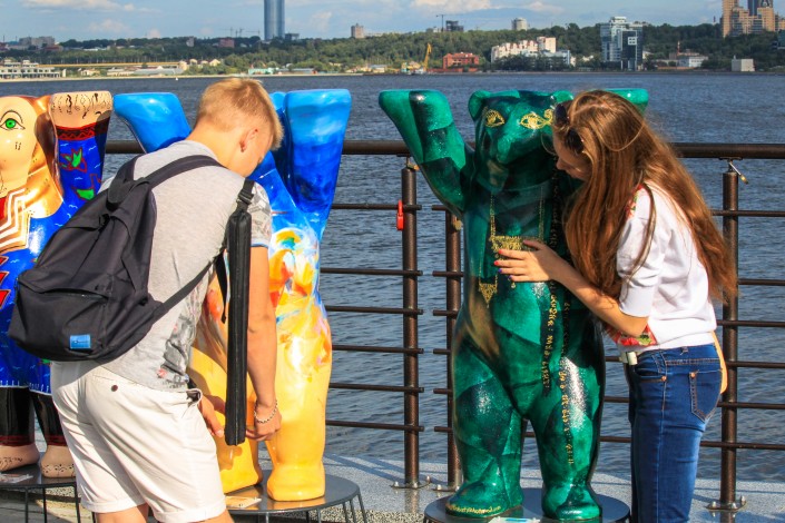 Казахстанский мишка представлен на международной художественной выставке The Minis United Buddy Bears в Казани, сообщает корреспондент Tengrinews.kz.