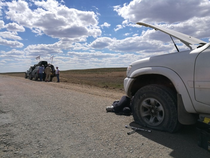 Не обошлось в экспедиции и без поломок. Из-за сложных дорожных условий и больших дистанций техника периодически давала сбой. Так, по пути в Мангистаускую область участникам экспедиции пришлось остановиться на ночлег в одном из станционных домиков. Рабочие железной дороги станции Торыш любезно приютили у себя путников, задержавшихся в дороге из-за поломки.