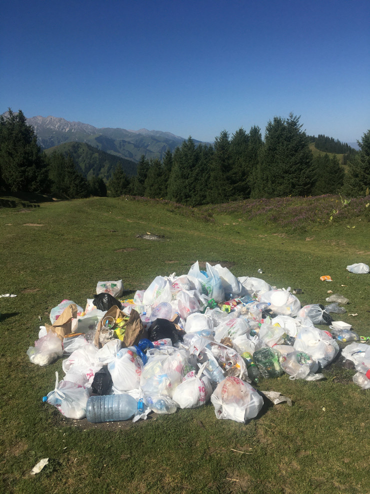 Группа энтузиастов, увидев фотографии оставленного мусора на Кок-Жайлау, решила подняться на склон и очистить его. 15 волонтеров собрали более 17 пакетов (каждый по 60 литров) и спустили с гор.