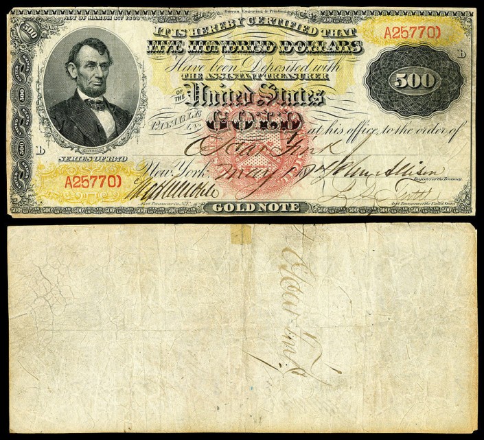 Золотой сертификат на 500 долларов (1870-1875 годы) с портретом 16-го президента США Авраама Линкольна.