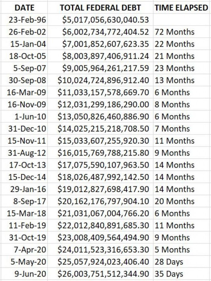 5 мая долг США впервые превысил отметку в 24 триллиона долларов, который был зарегистрирован 7 апреля 2020 года. Спустя 35 дней долг превысил 26 триллионов долларов.