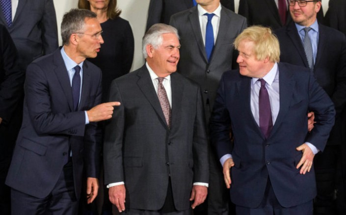 Генсек НАТО Йенс Столтенберг, госсекретарь США Рекс Тиллерсон и министр иностранных дел Великобритании Борис Джонсон на встрече в Брюсселе. © EPA