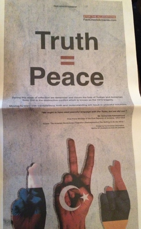 На улицах Нью-Йорка и Бостона появились плакаты с политической рекламой протурецкого движения, отрицающего факт геноцида армян, сообщает РИА Новости.
