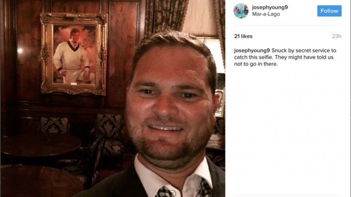 Джезеф Янг заявил, что ему удалось "проскользнуть" через Секретную службу, чтобы сделать селфи. "Им следовало сказать нам, чтобы мы сюда не заходили", - подписал Янг выложенную в Сеть фотографию на фоне портрета молодого Трампа за спиной.