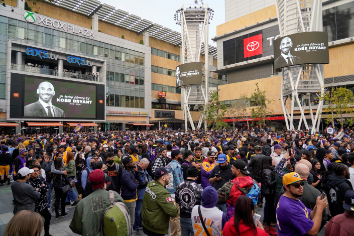 Болельщики несут цветы и ставят свечи около домашней арены "Лос-Анджелес Лейкерс" - клуба, в котором на протяжении 20 лет играл баскетболист.