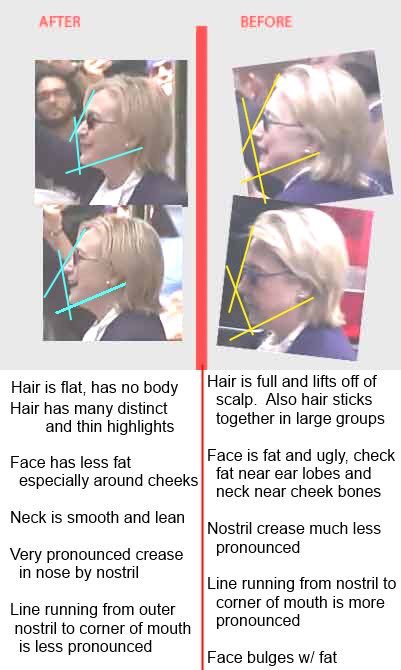 В качестве доказательства в социальных сетях активно распространяются фотографии, на которых наглядно "показаны" физические различия настоящей Хиллари и ее двойника. Так, конспирологи обращают внимание на ее нос: якобы у двойника его кончик опущен, а у Хиллари он вздернутый. Мочки ушей у них тоже разные, указательный палец у "фальшивки" короче и ноги у последней слишком худые.