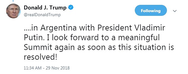 "Основываясь на факте, что корабли и моряки не вернулись в Украину из России, я принял решение, что в интересах всех вовлеченных сторон отменить мою ранее запланированную встречу в Аргентине с президентом Путиным. Я с нетерпением жду содержательного саммита вновь как только ситуация будет разрешена!" - написал глава Белого дома.