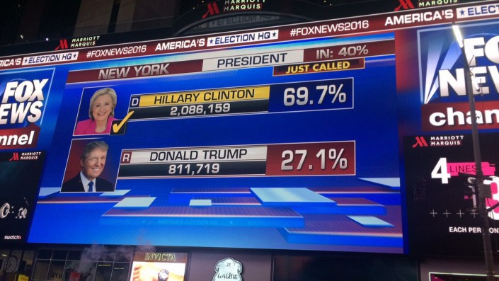 Тем временем, согласно табло, в Нью-Йорке лидирует Хиллари Клинтон.