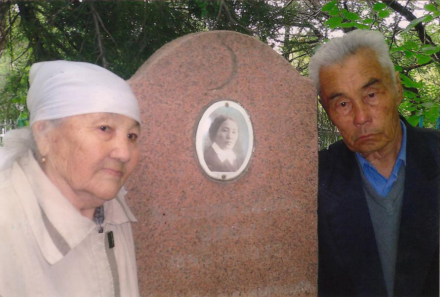 Кабира Карабалина со своим братом Болатом около могилы матери Айыш