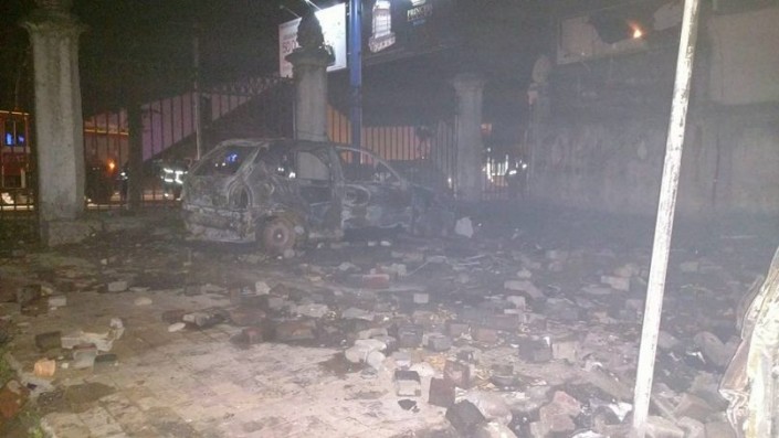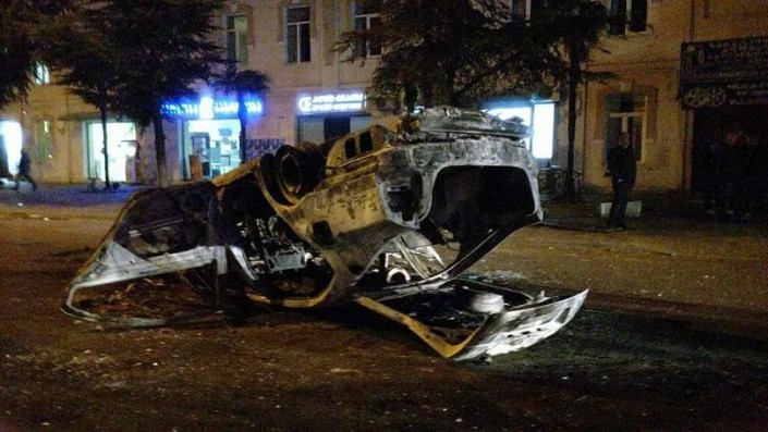 Однако толпа на этом не успокоилась, напротив, митингующие стали жечь костры на улице Чавчавадзе, рушить ограды, кидать петарды и бутылки с зажительной смесью во двор здания патрульной полиции, громить и жечь полицейские машины.