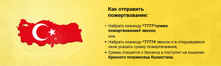 Каждый клиент оператора теперь имеет возможность перечислить со своего баланса любую сумму от 10 до 172 500 тенге на счет ОО "Красный Полумесяц РК". Сделать пожертвование можно по команде *7777*сумма пожертвования#звонок или набрать команду *7777# звонок и в открывшемся окне указать сумму пожертвования. Команда набирается в поле дозвона. Отчет о собранных средствах будет здесь. Далее эти средства будут направлены в "Красный Полумесяц Турции" и "Красный полумесяц Сирии".