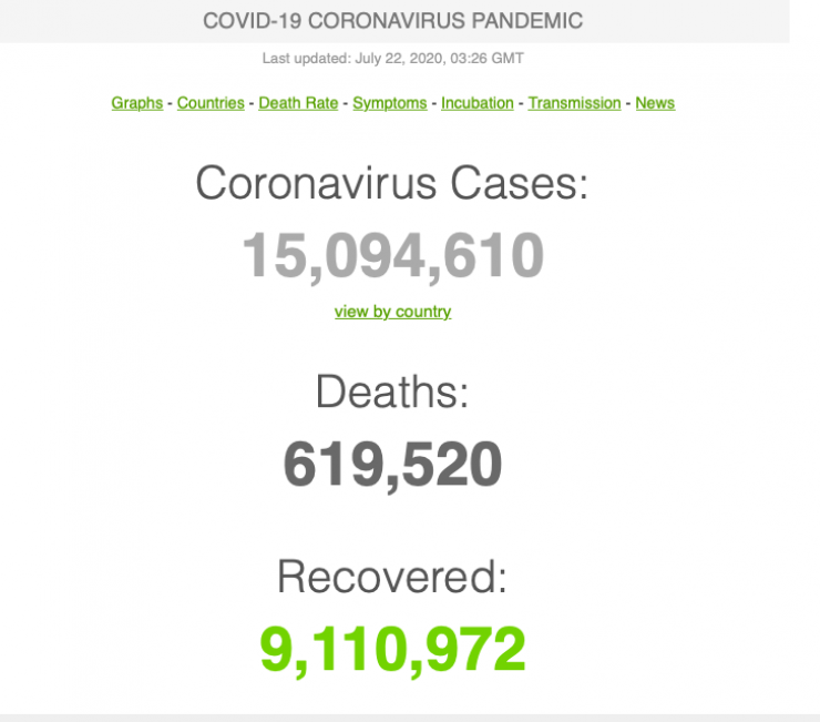 Информация Worldometers опережает данные других порталов. К примеру, на сайте Университета Джонса Хопкинса сообщается о 14 898 145 случаях заражения коронавирусом.
