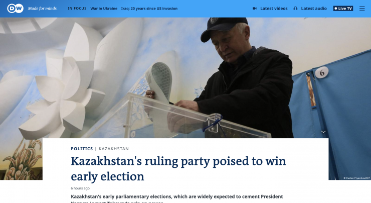 В немецком издании Deutsche Welle выпустили статью под заголовком "Правящая партия Казахстана может победить на досрочных выборах", в которой подчеркнули высокую оценку международных наблюдателей на выборах.