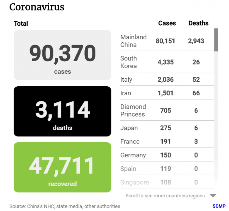 По состоянию на утро 3 марта количество скончавшихся от нового типа коронавируса во всем мире достигло 3114, заболевших - 90 370, выздоровели свыше 47 тысяч человек. Об этом сообщает газета South China Morning Post со ссылкой на государственный комитет по здравоохранению.