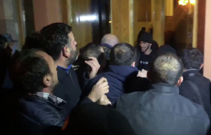 Сначала произошла небольшая стычка между охранниками и демонстрантами, позже уже группа мужчин все же добралась до Мирзояна и избила его.