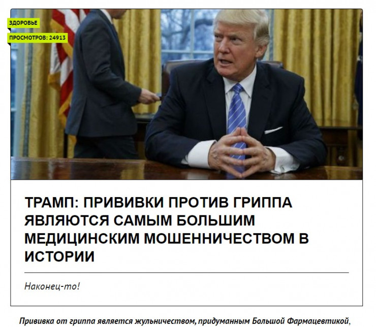 В Сети появилась информация о том, что бывший президент США Дональд Трамп якобы назвал вакцинацию от гриппа "жульничеством, придуманным Большой Фармацевтикой", передает Tengrinews.kz со ссылкой на Stopfake.kz.