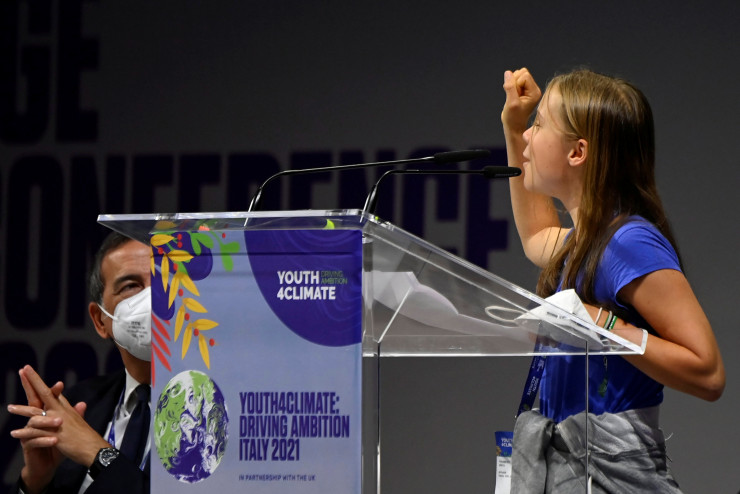 Выступая на конференции Youth4Climate, предшествовавшей конференции COP26 в Милане, Тунберг раскритиковала правительства за то, что они "бесстыдно поздравляют себя", не давая достаточных обещаний по сокращению выбросов, и заявила, что политики "приглашают на подобные встречи отобранных молодых людей, чтобы сделать вид, что они слушают нас, но это не так".