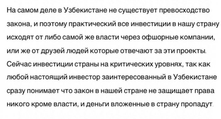 "На самом деле в Узбекистане не существует превосходства закона, поэтому все инвестиции в нашу страну исходят от самой же власти через офшорные компании или же от друзей людей, которые отвечают за эти проекты... Видимо, власть считает, что народ настолько глупый, что не видит происходящего, но это не так", - заявляет Иман Каримова.