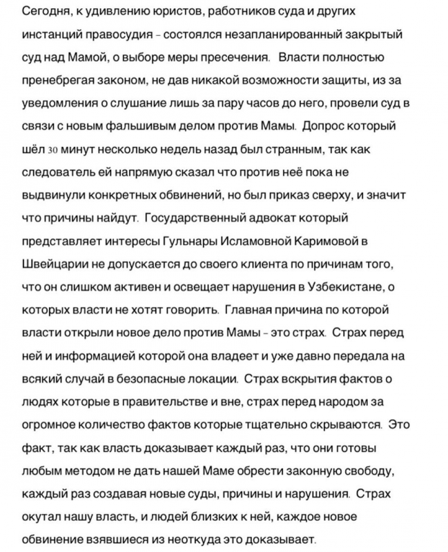 "Пока продолжаются цирк и клоунада вокруг нашей мамы, Узбекистан все больше доказывает, что, кроме громких заявлений и косметических изменений, в стране прогресса нет. ... Почему власть боится тех фактов, которыми располагает мама. Отвлечь народ от исхода этой информации будет невозможно..." - заключает она.