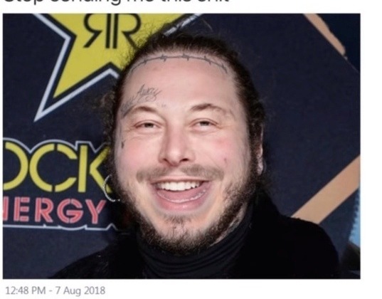 Особенно Илону Маску понравилась картинка, где его фотографию совместили с лицом музыканта Post Malone. Подпись под фото гласила: "Хватит отправлять мне это". Этот мем миллиардер оценил в восемь баллов.
