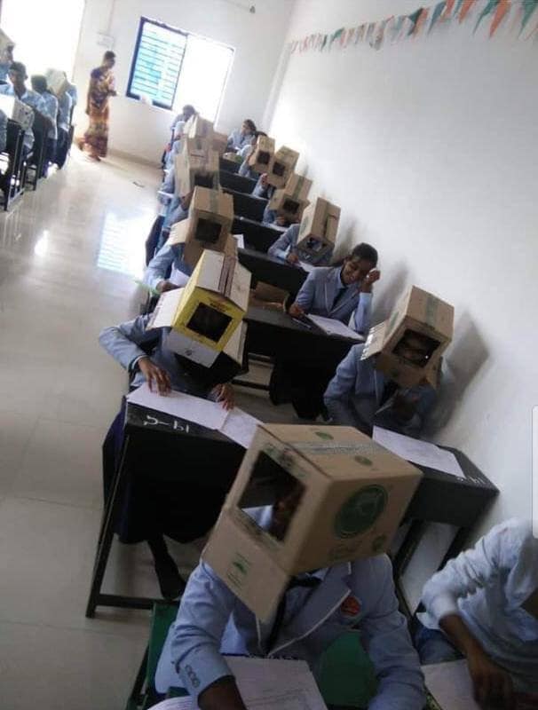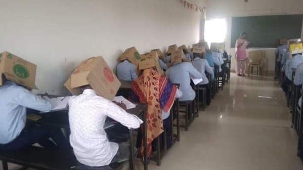 Индийским студентам на время экзамена надели на головы картонные коробки. В Сети появились фото, быстро ставшие вирусными, передает Tengrinews.kz.